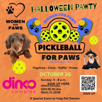 Women for Paws is hosting its annual Halloween Dog Pawty and this time we are making it a pickleball event at Dinko Complex. This year we are pickleballing for paws by offering playtime, clinic, raffle, and lots of fun. Bring your friends, family, and don't forget the family dog. We highly encourage halloween costumes for dogs.