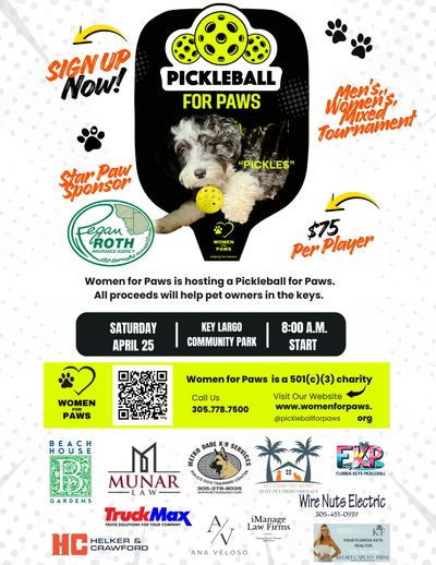Women for Paws is hosting its first Pickleball for Paws tournament in Key Largo. This fundraiser is being planned to create awareness about helping pet owners that are struggling financially to pay for their pet's medical emergencies. We will be pickleballing for the paws by offering a tournament style event, raffle, and lots of fun. Bring your friends, family, and don't forget the family dog.
